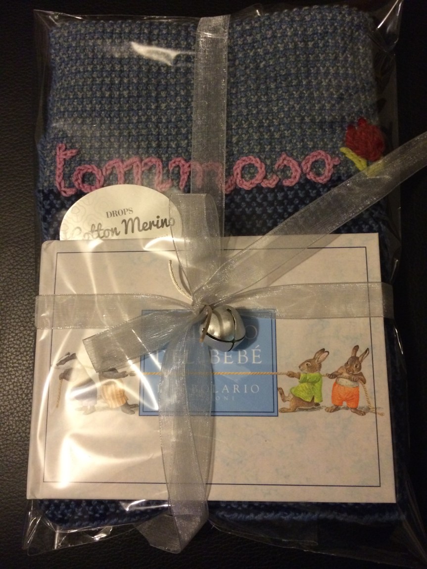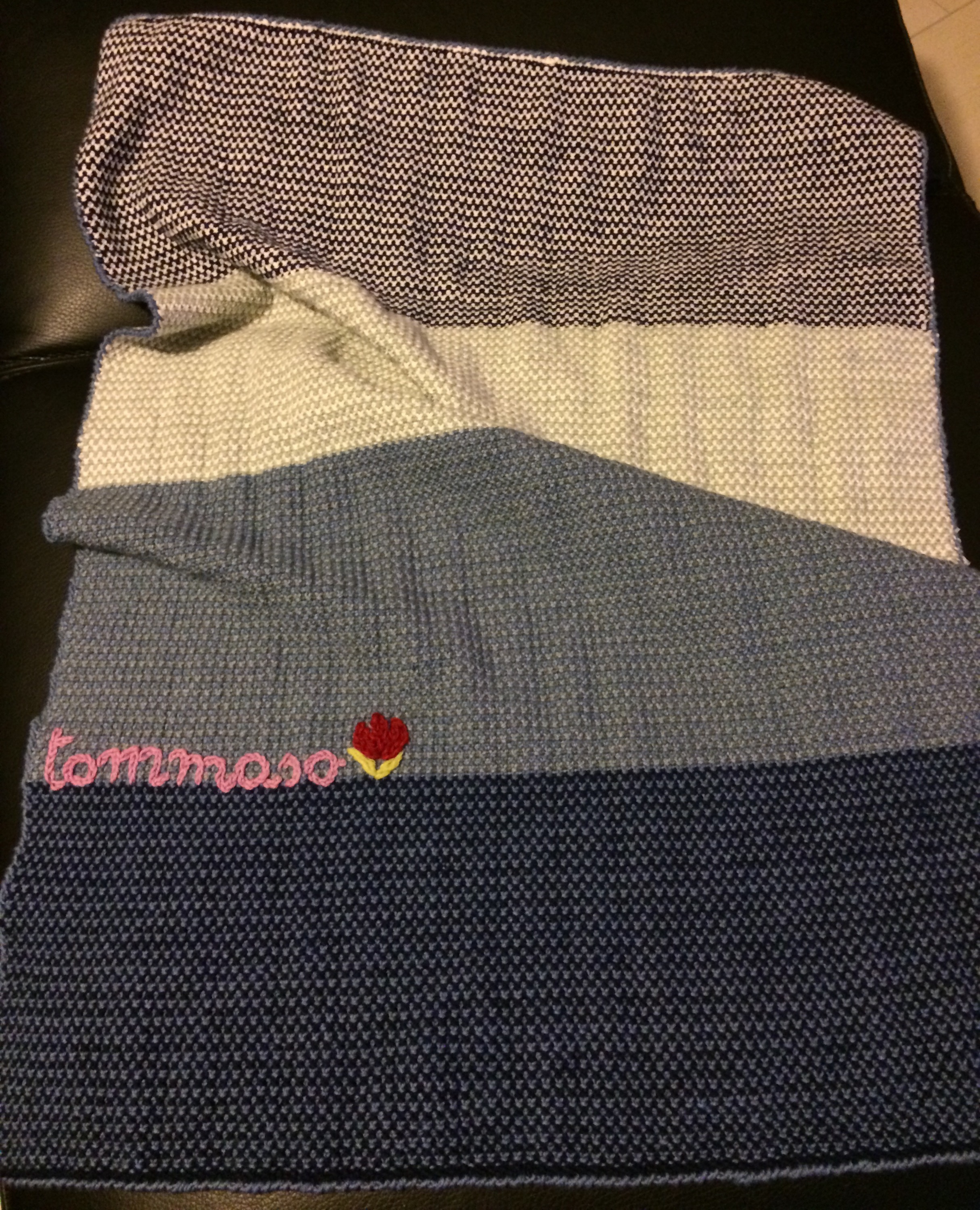 Alla fine, Marinunzia Piccenna (il suo laboratorio in Via Solari 19 a Milano offre corsi per sferruzzatrici più o meno esperte) ha reso questa copertina unica e personalizzata ricamando il nome di Tommaso e un piccolo tulipano. Io ho poi confezionato il tutto in questo modo: