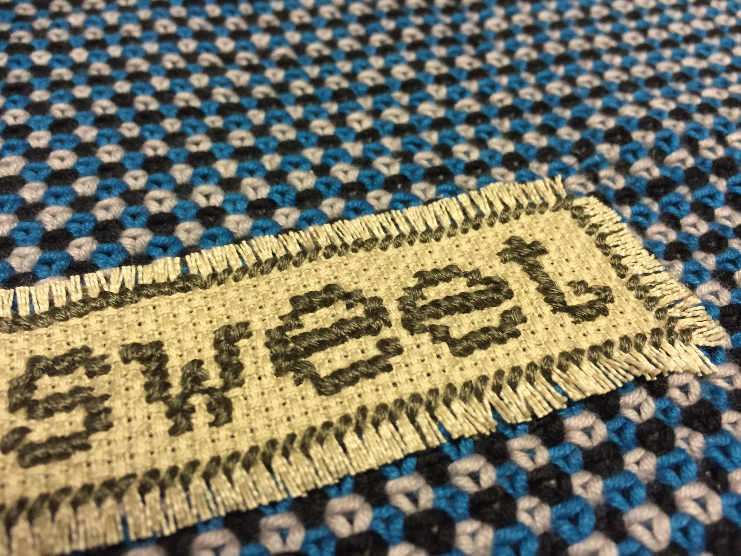 Il bordo è una fascia più larga delle successive perché ho usato un gomitolo e mezzo blu, poi ho usato il bianco ma ho sempre mantenuto il bordo a falsa costa inglese (31 maglie all’inizio e 31 alla fine di ogni riga. Mi sono aiutata con dei segnapunti mobili per non impazzire). Il grigio scuro e quello chiaro si sono alternati al bianco con la maglia rasata (lavorare una riga a diritto e la successiva a rovescio) e questo mi ha permesso di concludere il lavoro in tempi rapidi pur ottenendo un ottimo risultato. Ho concluso con 75 grammi di blu sempre a falsa costa inglese.