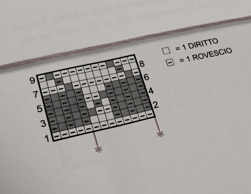 Riga 9: una maglia a rovescio, una maglia a diritto, tre maglie a rovescio, ripetere quattro maglie a rovescio, una maglia a diritto e tre maglie a rovescio;