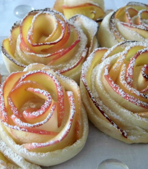 La seconda idea è culinaria. Sono le rose di mele (su Google con questo nome). Servono 2 mele rosse, 1 sfoglia rettangolare di pasta brisè è un po’ di marmellata di albicocche. La mela va ripulita del torsolo, divisa in due parti e poi tagliata in fette sottili. Queste ultime vanno ripassate al microonde ma credo non sia fondamentale e al più rimarranno leggermente più croccanti se non si esegue il passaggio. La marmellata va diluita con poca acqua e dopo aver tagliato delle strisce di sfoglia, va spennellata su di esse. Sul bordo (solo da un lato) bisogna disporre le fettine di mela sovrapponendole una all’altra. Chiudere la sfoglia e arrotolare. In forno (non ho idea del tempo necessario quindi controllerò spesso la cottura) e questo è il risultato: